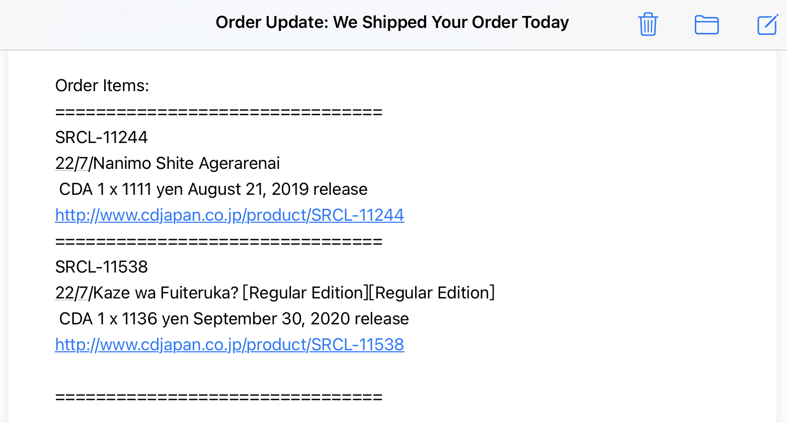 另外,cdjapan发货时会随包裹外面在塑料夹层里面的运单附上具体的商品价格清单,以便海关处理,这点给个赞。